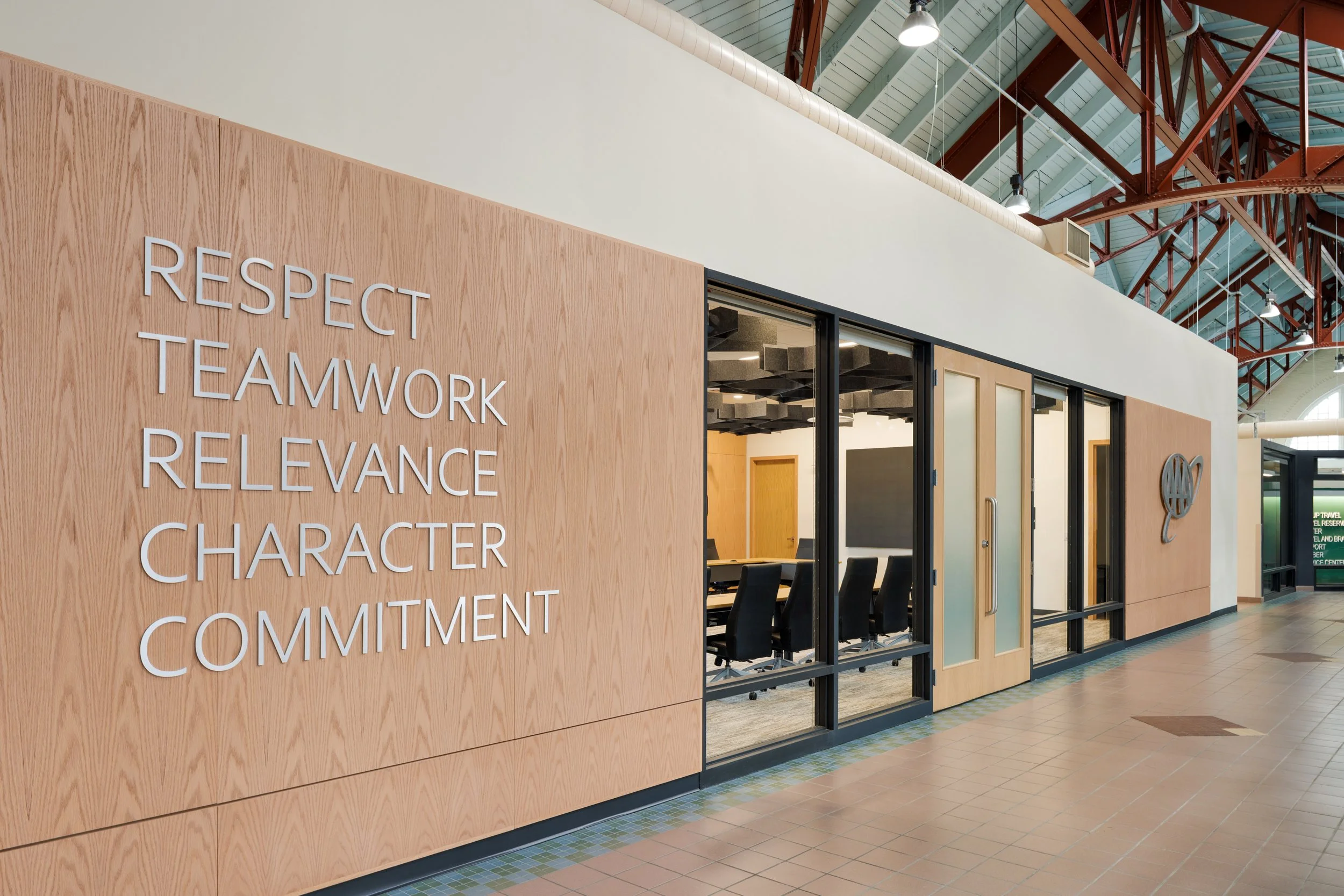 We were tasked with designing a nearly complete renovation of the upper floor of Motor Square Gardens in Pittsburgh, PA. AAA wanted to consolidate nearly all of their staff onto one floor to free up additional space in the building for lease. The renovation added over 50 private offices, centered around natural light and acoustic privacy. It also included an executive board room & conference suite, employee break areas, smaller meeting areas, storage, and updated restrooms. The renovation maintained the existing character of the building in the central atrium, while updating everything beyond the glass storefronts into a modern working environment. The design also incorporated simple color-coded wayfinding elements to ease orientation and wayfinding in the space.